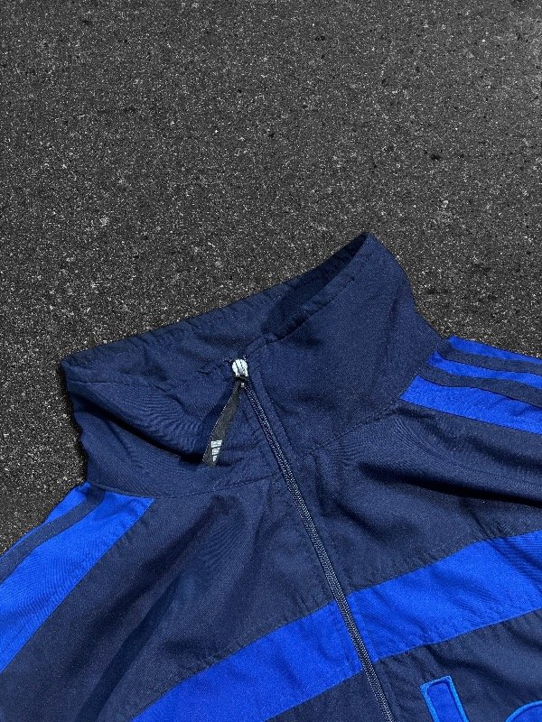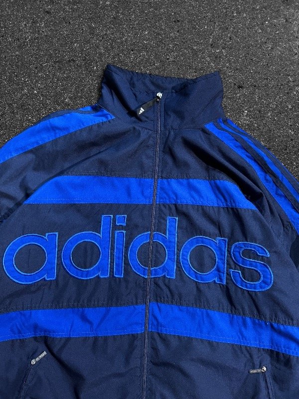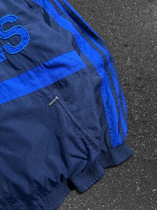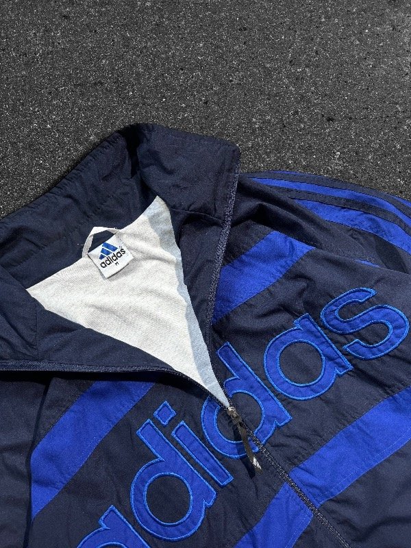 LOCURA DE CAMPERA ADIDAS VINTAGE BIG LOGO 1990s SPELLOUT BORDADO. BOLSILLOS LATERALES CON CIERRES. UNA LOCURA ORIGINAL. E IMPORTADA. CIERRES CON TIRANTES ADIDAS DE METAL. UNA JOYITA.